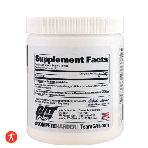 - GAT L-Glutamine là axit amin tinh khiết và đủ mạnh để được sử dụng bởi một số vận động viên thể chất và vận động viên giỏi nhất thế giới. Mỗi khẩu phần cung cấp 5,0 g chất lượng cao L-lutamine. Bởi vì nó không có hương vị, sản phẩm này có thể dễ dàng được thêm vào protein lắc, đồ uống trước hoặc sau khi tập luyện, hoặc đồ uống yêu thích của bạn.